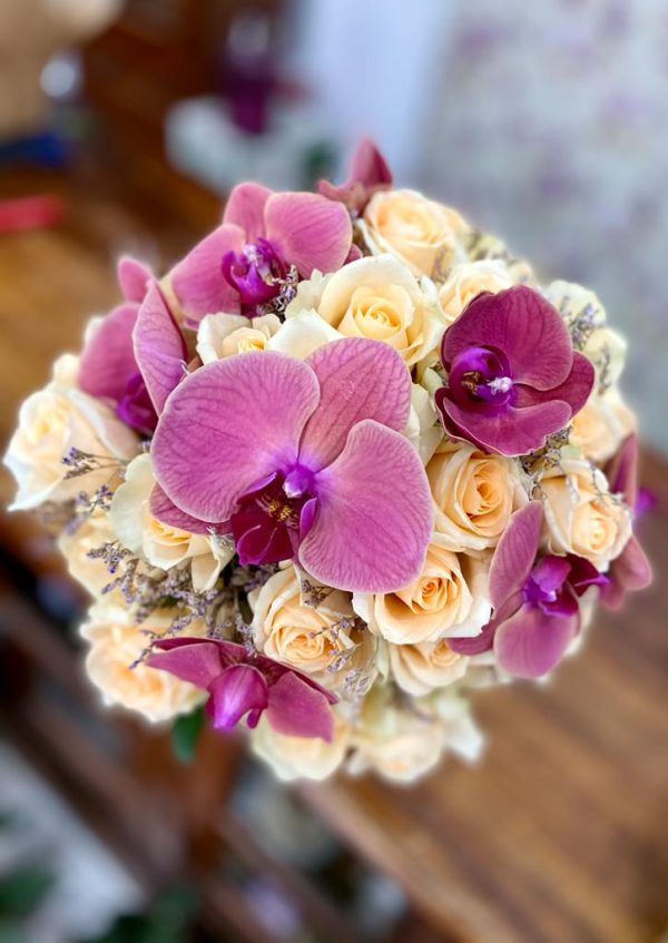 זה זר יוקרתי עם סחלבים אלגנטיים.