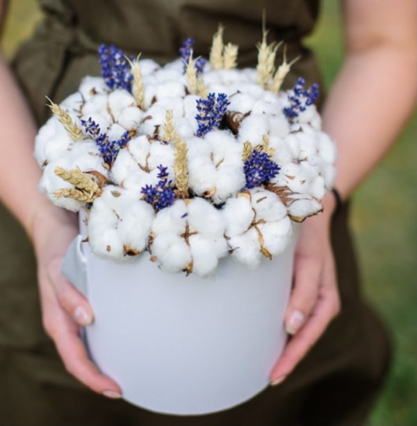 Soft cotton bolls combined with fragrant lavender and golden ears of wheat. This bouquet will delight you for a long