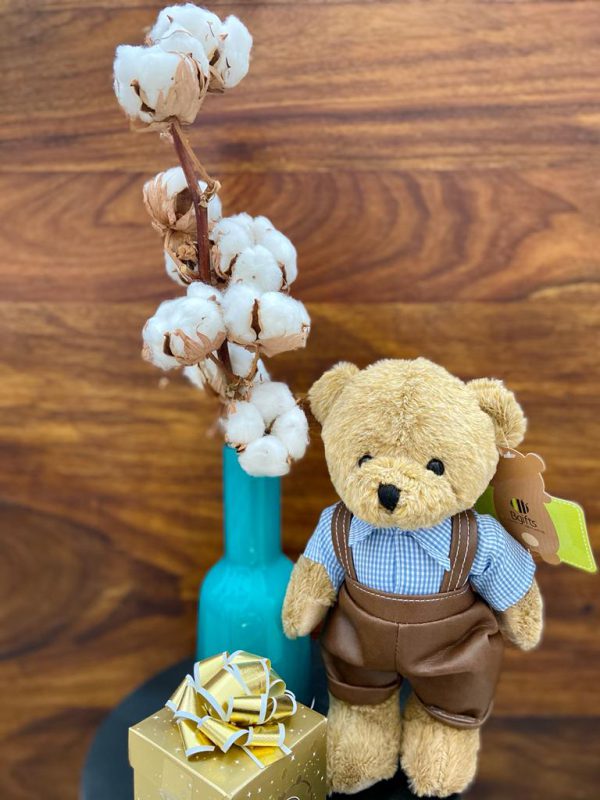 High quality vase from Europe, cotton branch, teddy bear and box of ferrero rocher chocolates.